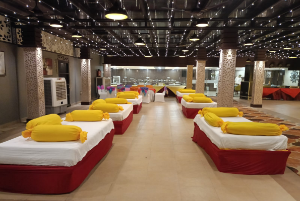 Hall can accommodate 100 - 350 guest(s) Veg Menu starting price of Hall is Rs. 1000 per plate. and Non Veg Menu starting price of Hall is Rs. 1200 per plate.